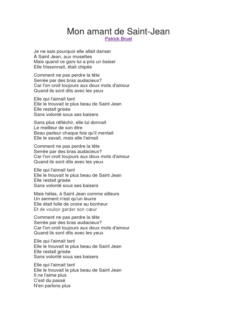 patrick bruel mon amant de saint jean lyrics genius lyrics