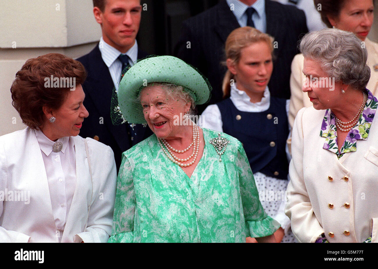 la reine mere est rejointe par la reine et la princesse margaret a l exterieur de clarence house a l occasion de son 93e anniversaire 15 02 02 la reine mere avec la princesse margaret
